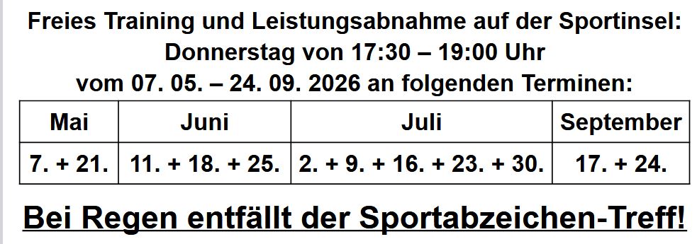 | U18/U20/Erwachsene Sprint/Hürde Christine und Jan | Montag Mittwoch Freitag Samstag | 17:15-19:30 17:15-19:30 17:15-19:30 10:00-12:30 | Sportinsel Sportinsel nach Absprache Sportinsel |